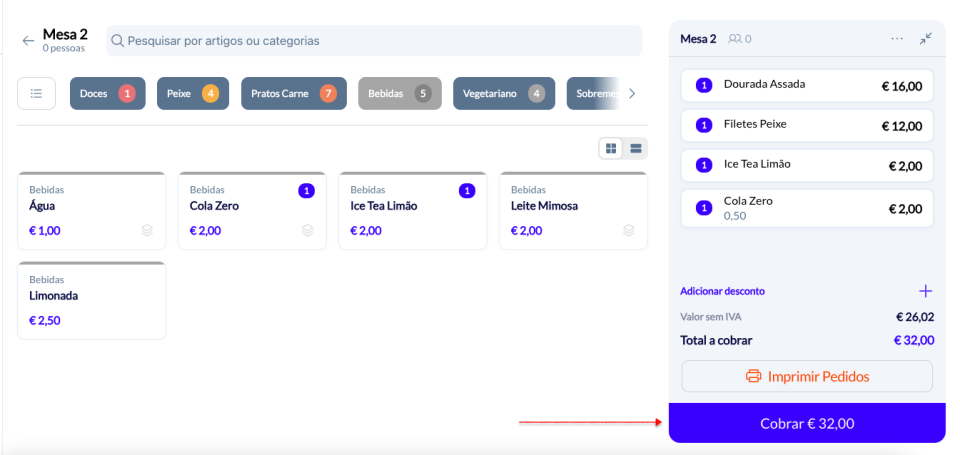 Muitas vezes, em restauração, há a necessidade de dividir a conta total pelos clientes ou separar itens para faturar a diferentes pessoas. No POS, após ter os produtos na mesa, clique em cobrar para passar para o ecrã seguinte: