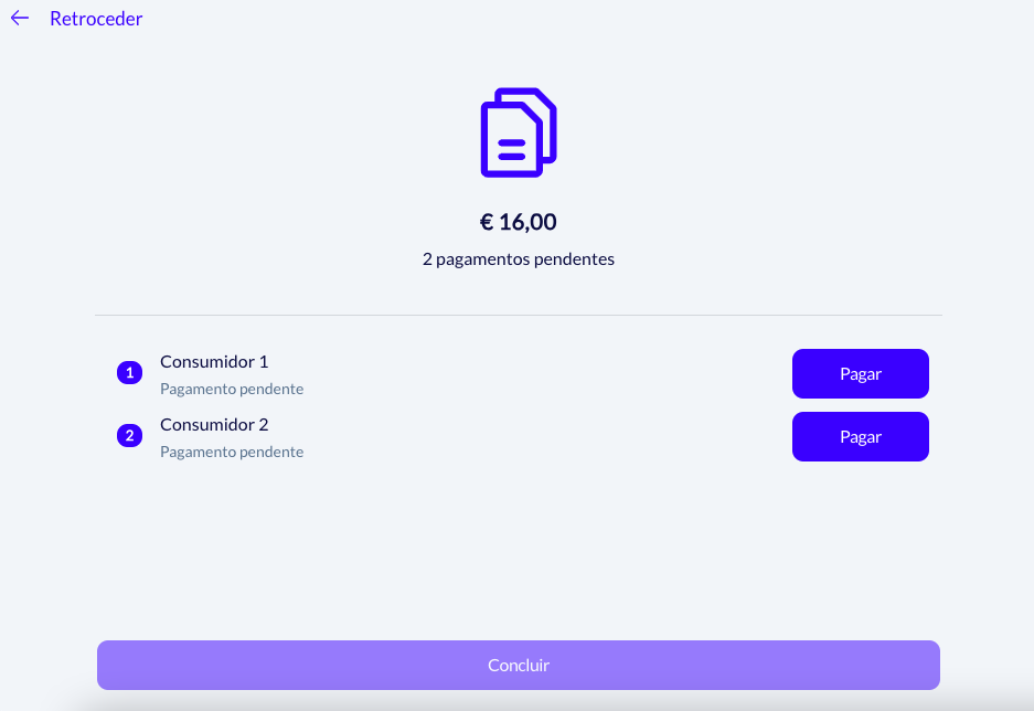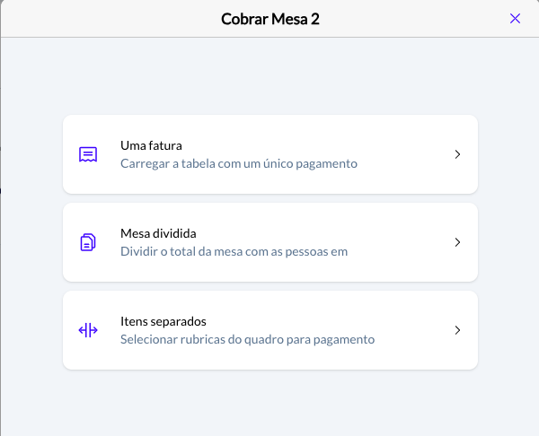 - Uma fatura: cobra a mesa uma vez apenas, emitindo uma fatura;