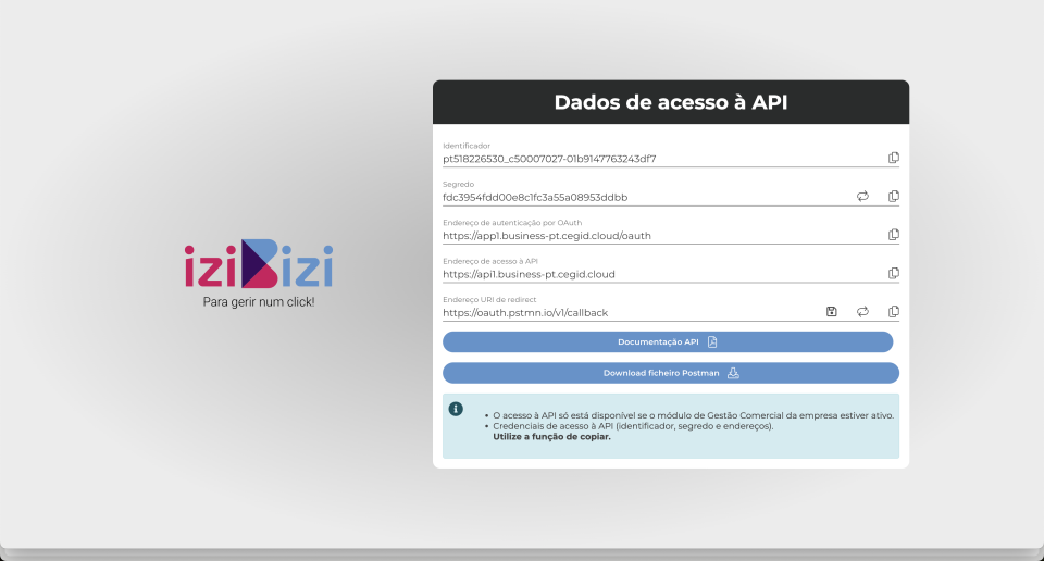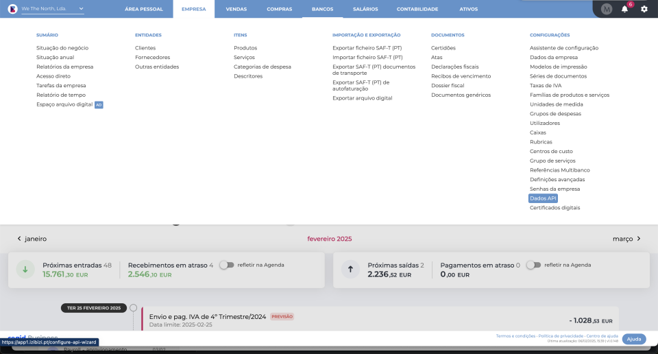 1. Na sua conta IziBizi em "Empresas" clique em "Dados da API"
