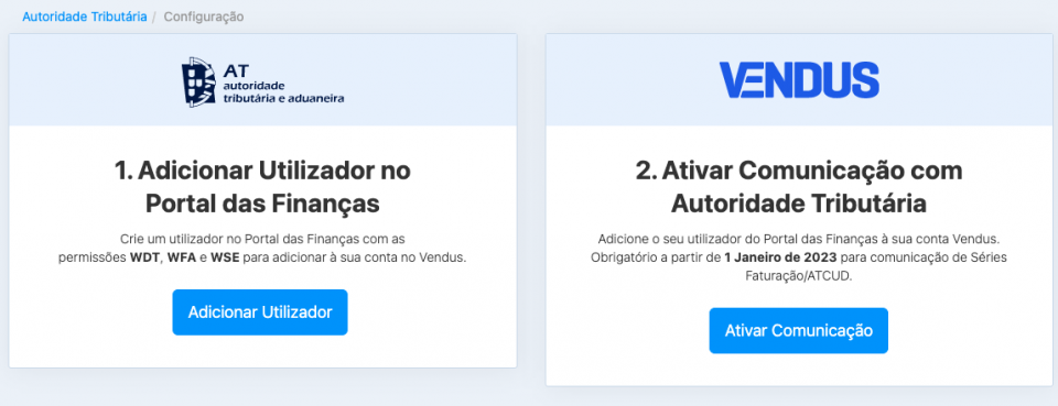 Se já tiver um utilizador configurado para por exemplo comunicar o SAFT, basta entrar no site da AT com o seu utilizador normal (o contribuinte) e adicionar a opção WSE no subutilizador, que corresponde à comunicação de séries. Do lado do Vendus, em Gestão > Autoridade Tributária > Configuração coloque a indicação da nova opção que ativou.
