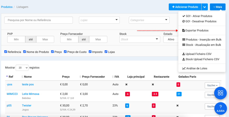 A listagem de produtos pode ser retirada de Gestão > Produtos > Produtos.