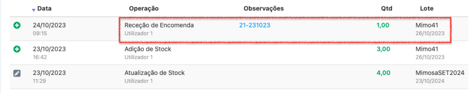 O produto dará entrada de stock associado então ao lote escolhido. Ao consultar as movimentações de stock associadas ao produto, no campo Lote encontrará a informação do lote recebido associado à respectiva encomenda.