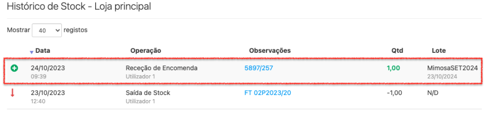 O produto dará entrada de stock associado então ao lote escolhido. Ao consultar as movimentações de stock associadas ao produto, no campo Lote encontrará a informação do lote recebido associado à respectiva fatura.