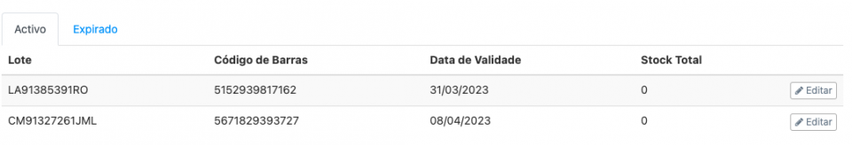 Tendo a informação adicionada, facilmente consegue ver o stock por lote na página principal do produto.