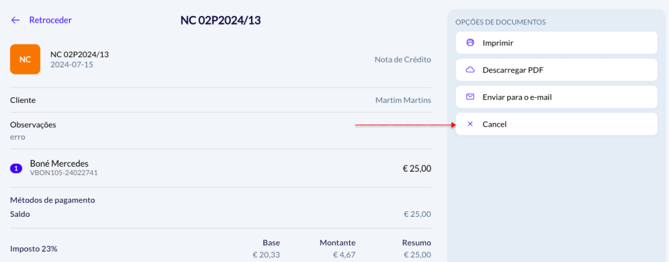 Pode cancelar uma nota de crédito directamente no POS.