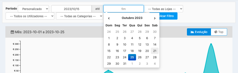 Caso necessite de consultar a venda dos produtos num determinado espaço temporal, como por exemplo a última semana, escolha em Período a opção Personalizado.