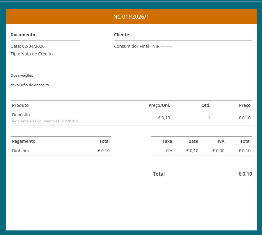 Sempre que um cliente queira devolver o depósito um produto vendido, deverá aceitar o mesmo e emitir uma Nota de Crédito com a devolução do depósito.